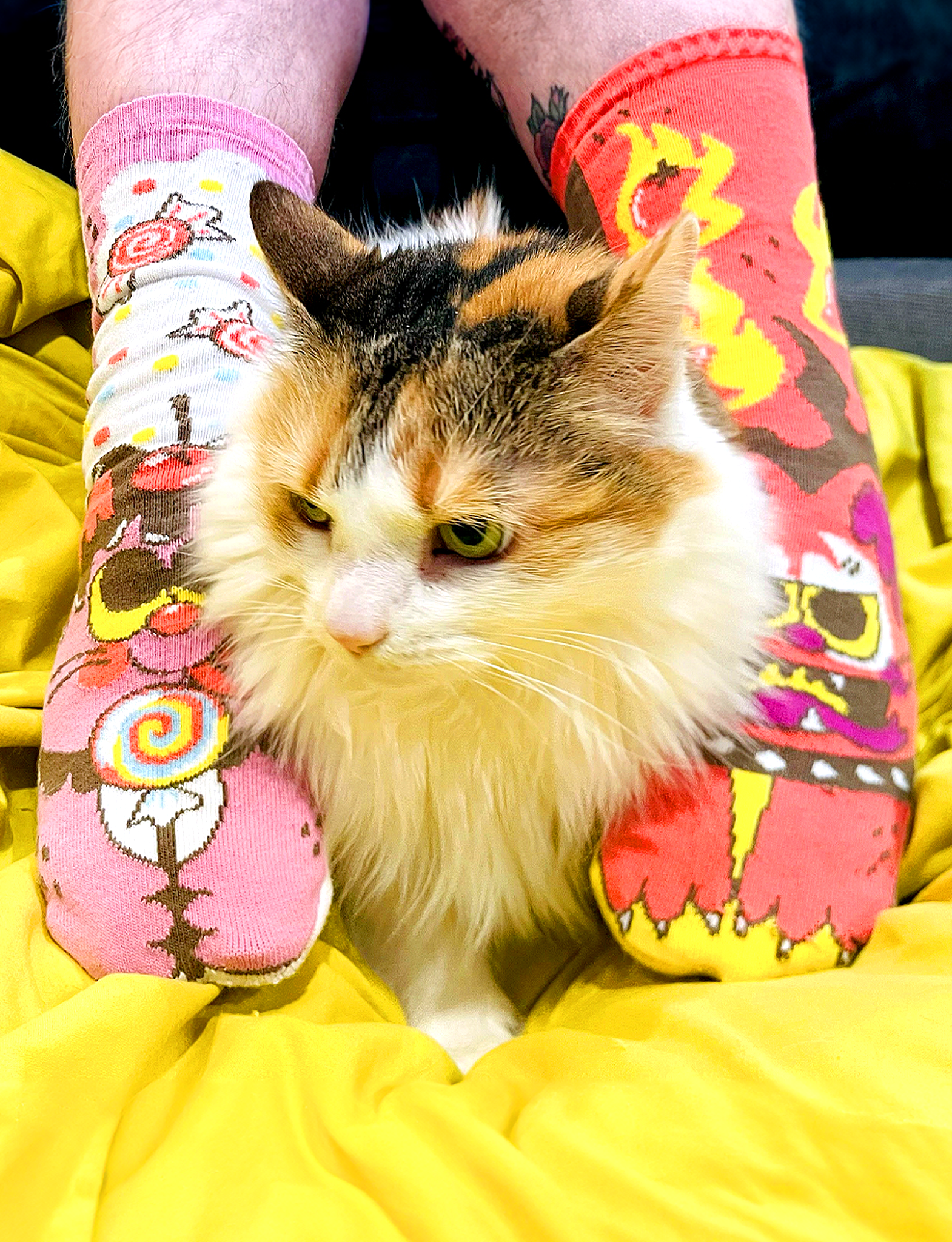 These Pals are full of delicious CATitude. Meet the PAWsome pals: Purrty Sweet as candy cat and hot-as-peppers Feline Spicy! These maximalist cat socks are 1 of 3 PURRfectly mismatched pairs from the limited edition Gabbercats Collection designed by the psychedelic cat artist Gabby Kash. |