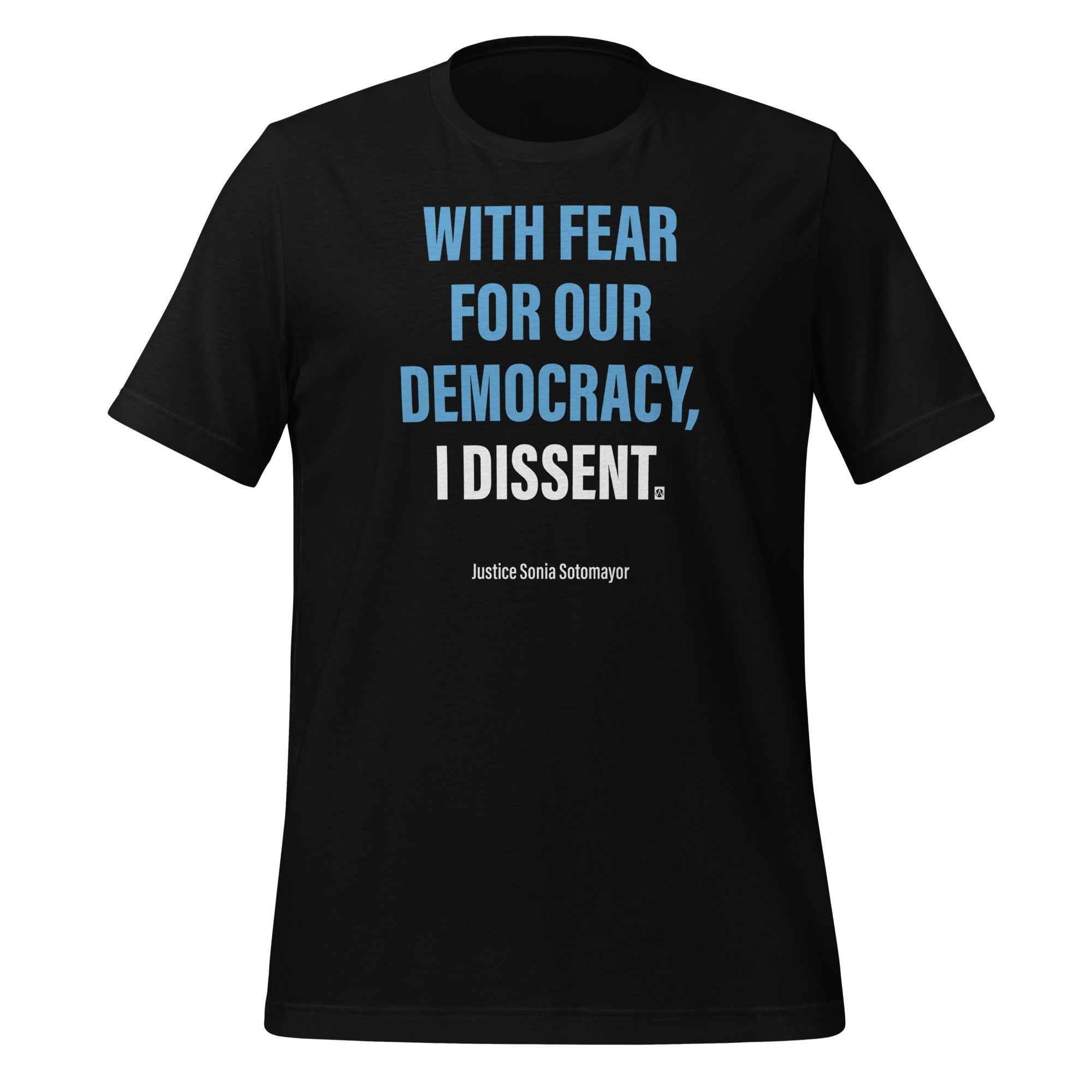 Justice Sotomayor’s iconic quote is an intentionally simple design in blue and white. It’s only available on black items to honor the black of her robe and the solemnity of this moment in our history.