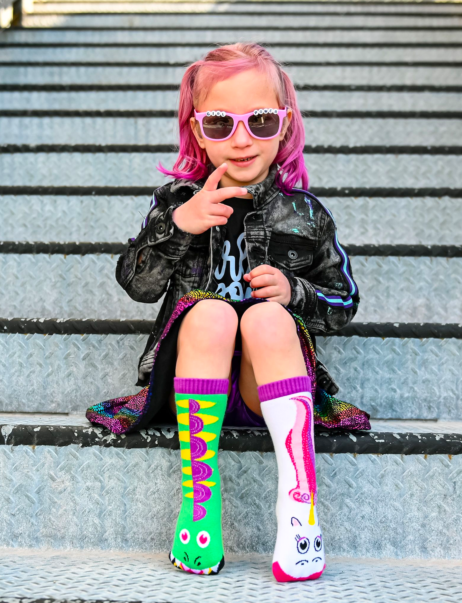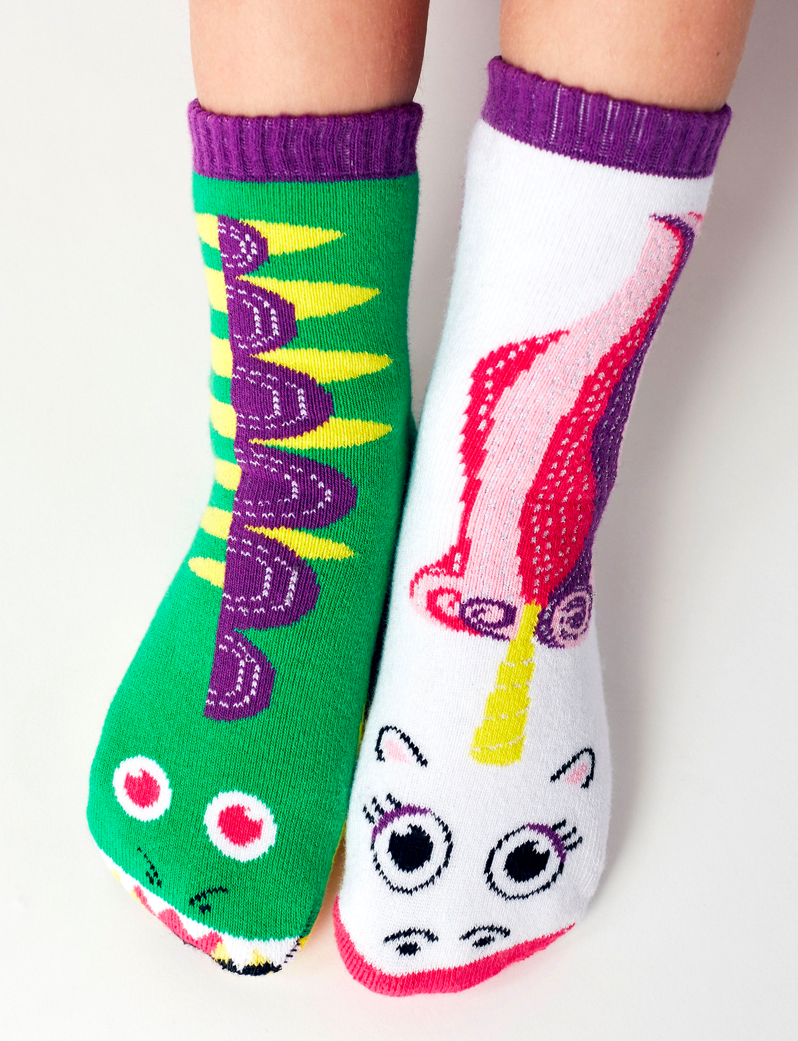 Your kiddos will feel all magical and sparkly as they frolic in our mismatched Dragon and Unicorn socks! These fun and whimsical mismatched foot friend socks are from the Pals Originals Collection. Kids sizes have non-slip silicon grips on the bottom to prevent slipping. |