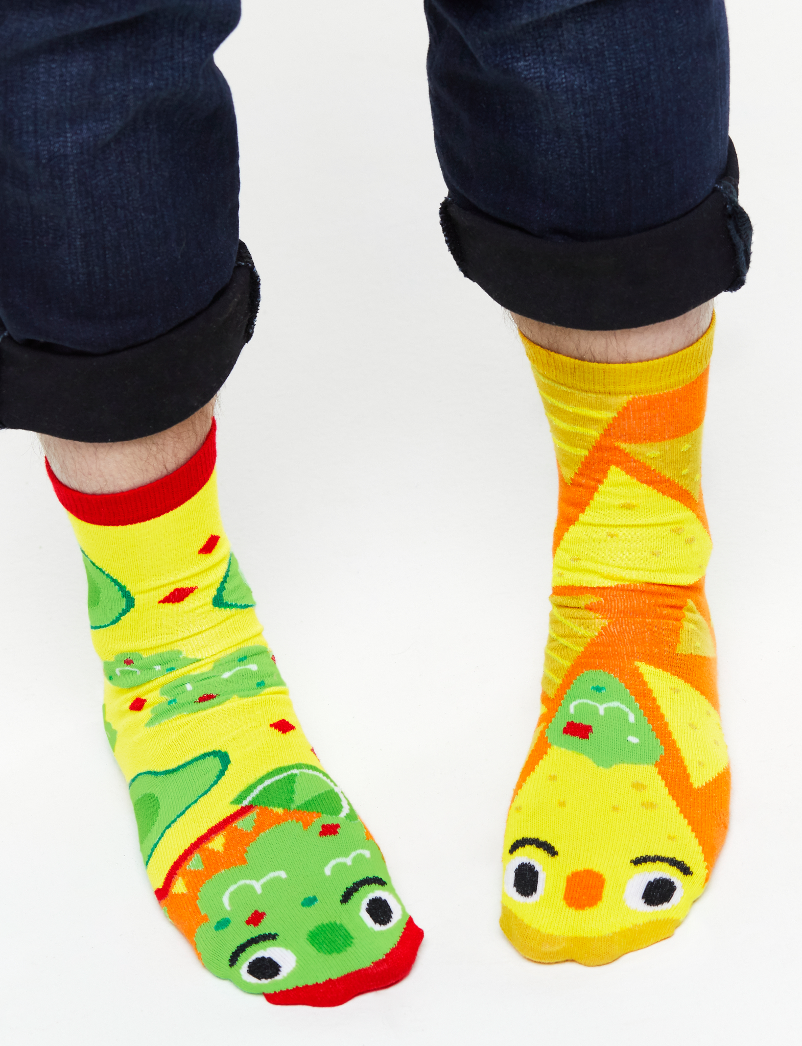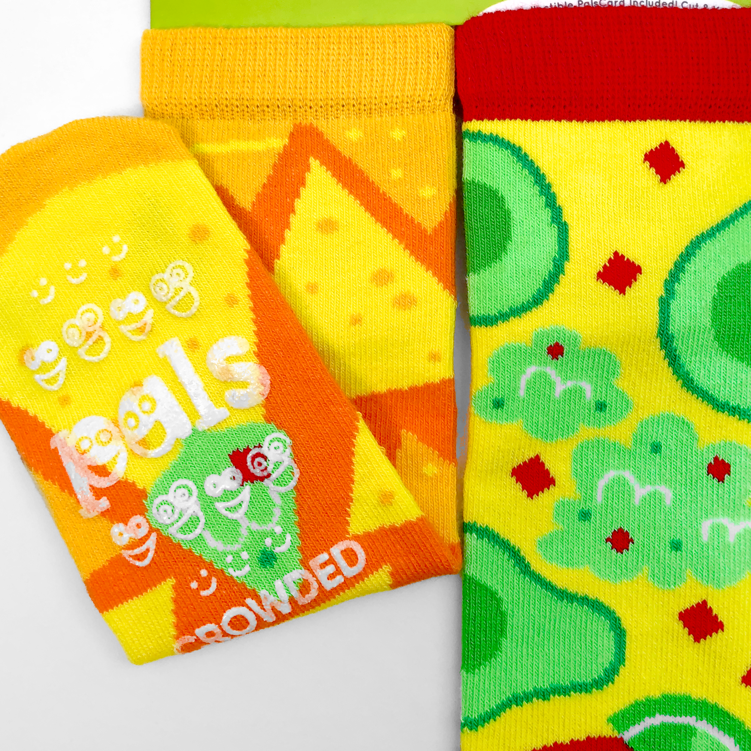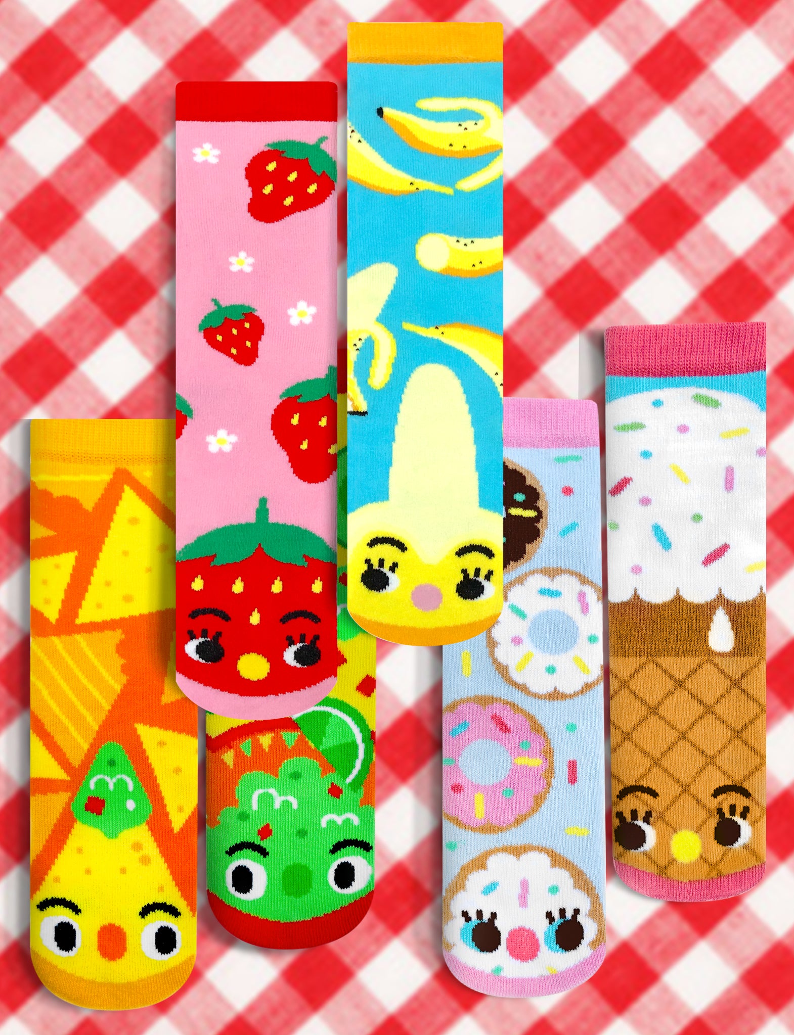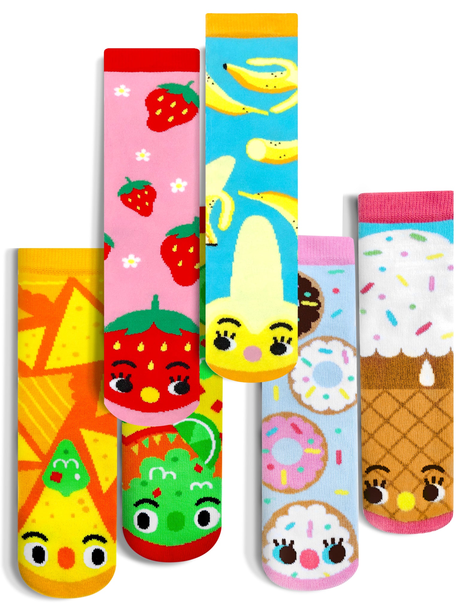 This tasty bundle of mismatched socks includes 3 DELECTABLE PAIRS from our food-themed Taste Buds Collection designed by Michelle Romo (aka Crowded Teeth). Sink your teeth (or toes) into Donut & Ice Cream, Strawberry & Banana, and Chips & Guac! Kids sizes have non-slip grips on the bottom to prevent slipping.|